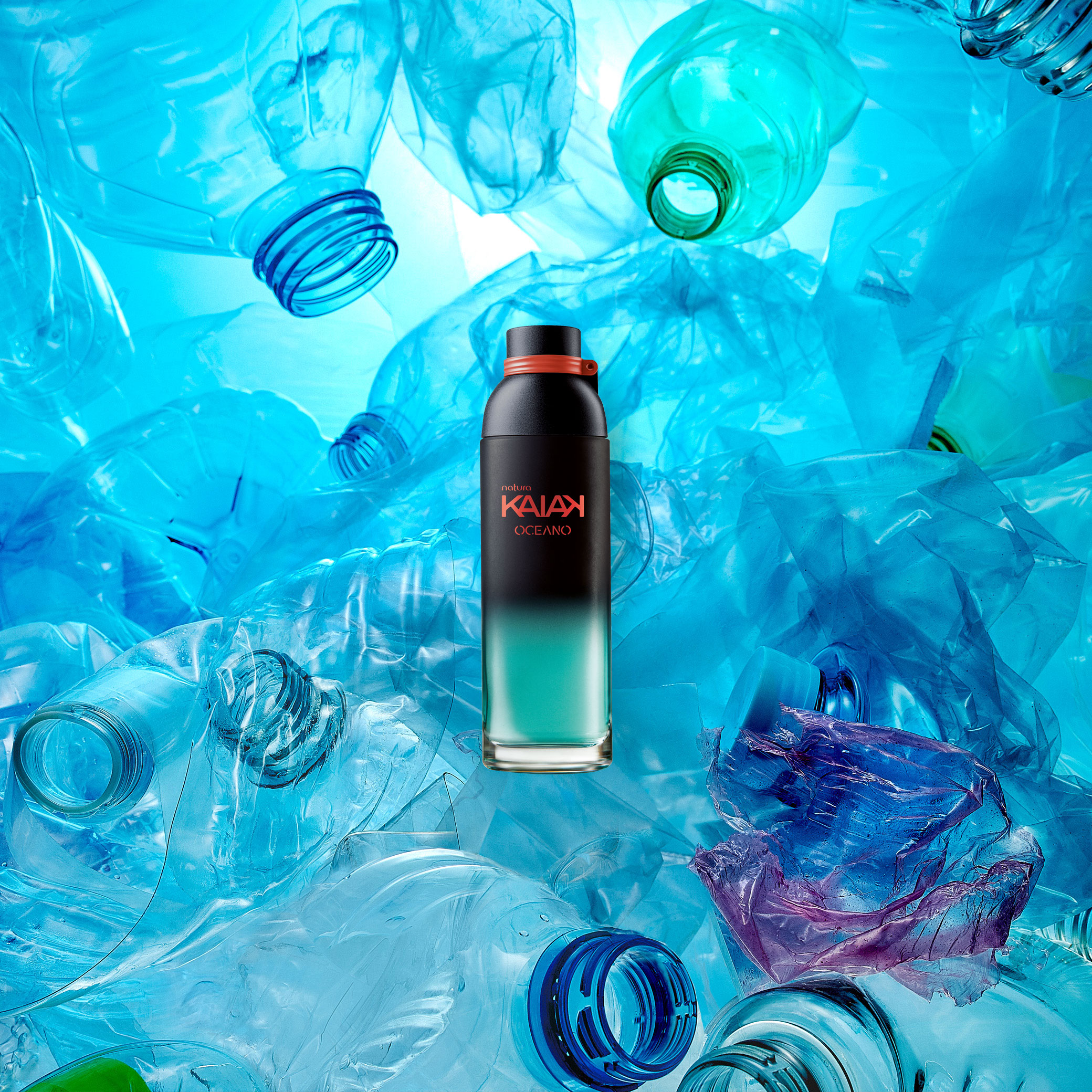 el nuevo envase de Kaiak está fabricado con un 20% menos de plástico y el 50% de todo el plástico es reciclado*, extraído del litoral y/o de redes de pesca desechadas. *% referido al promedio anual de plástico utilizádo en los envases de la perfumería Kaiak.