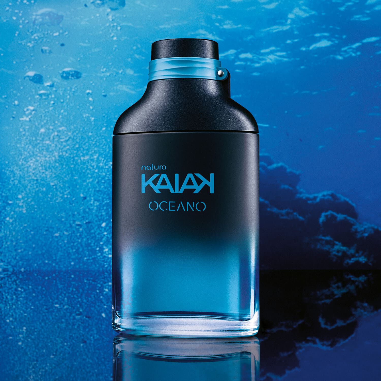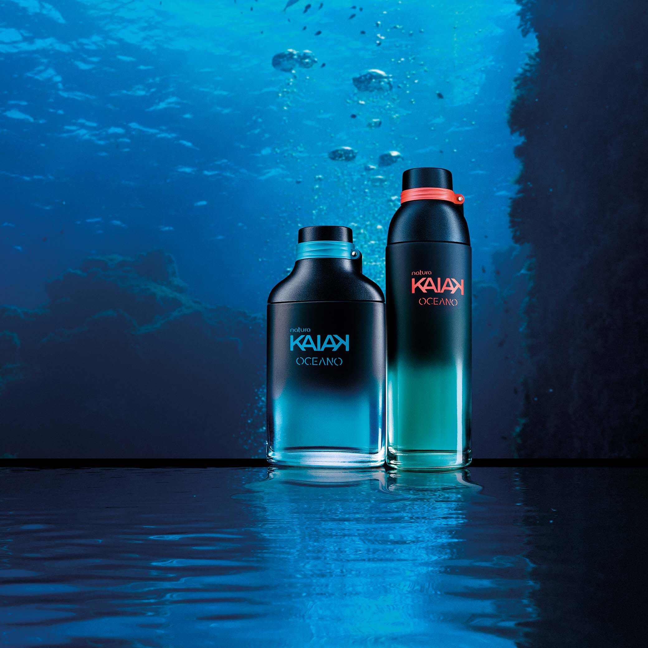 El nuevo empaque de Kaiak está hecho con un 20 % menos de plástico y el 50 % de todo el plástico es reciclado*, retirado del litoral y/o de cabos de pesca descartados. *Porcentaje referente al promedio anual de plástico utilizado en los empaques de la perfumería Kaiak.