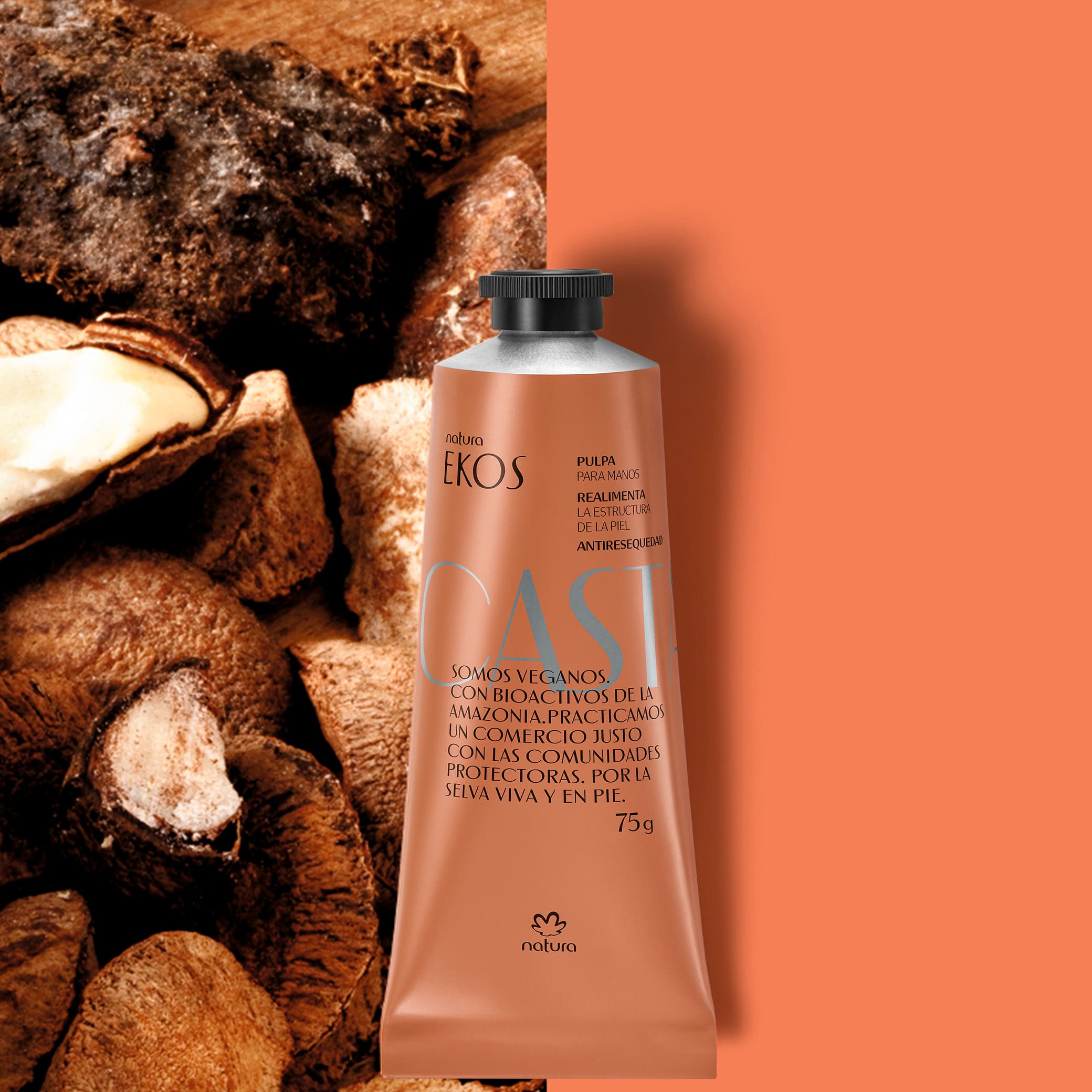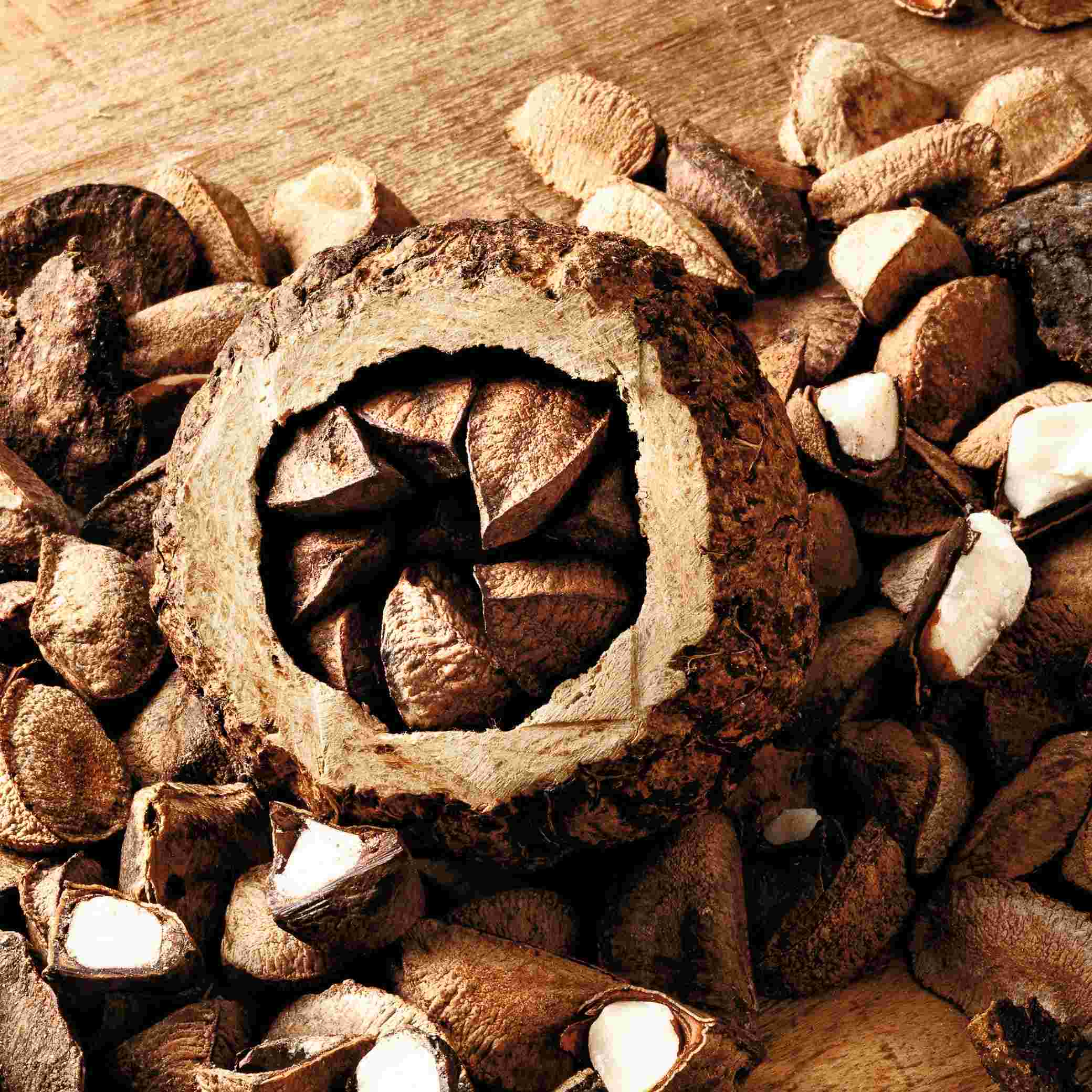 las castañas cosechadas de la naturaleza amazónica son una potencia biocosmética para la piel de tu cuerpo. Su aceite crudo es rico en omega 6 y 9, que trata y nutre la piel, además de hidratarla, dejando una fragancia envolvente y reconfortante.