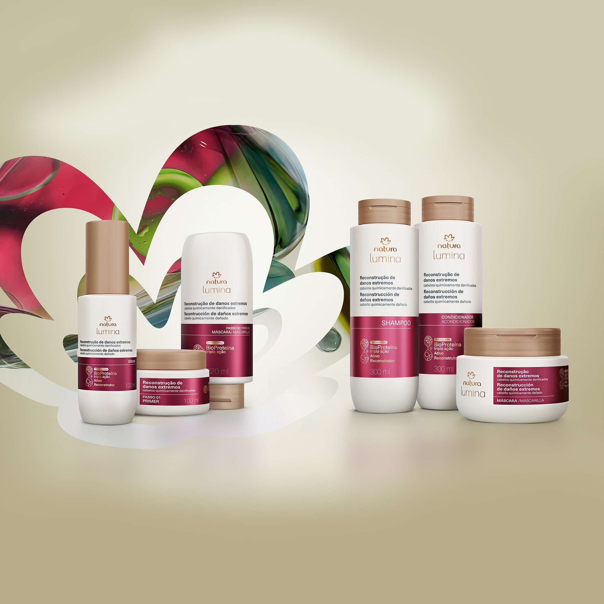 BioProteína Triple Acción + Activo Reestructurante: combinación exclusiva de activos que actúan en el relleno inteligente de los daños internos y en la reparación externa de la fibra capilar. promueven la reposición de lípidos y la reestructuración de las cutículas del cabello